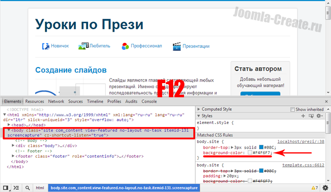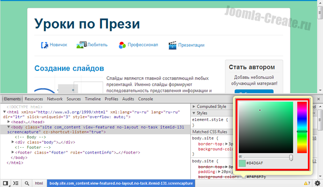 В левом окошке нажимаем по тегу: body. Справа нажимаем по иконке с цветом.