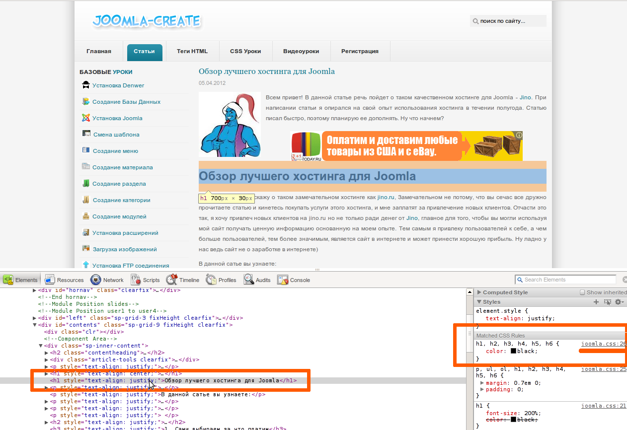 Оранжевым цветом я выделил элементы которые нам необходимы: в левом нижнем углу отображается HTML содержимое которое говорит нам, что это тег <h1>. В правом нижнем углу выводится используемый стиль CSS к нашему элементу(заголовку).