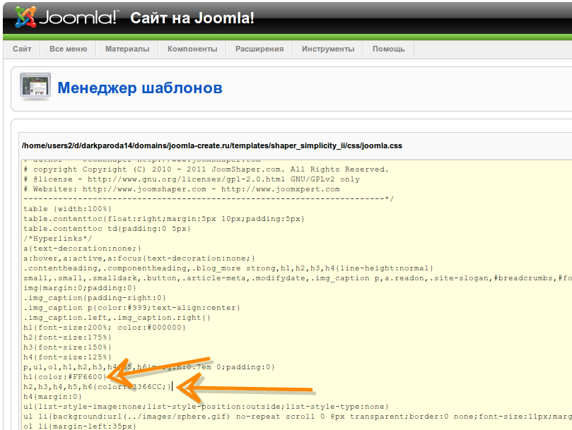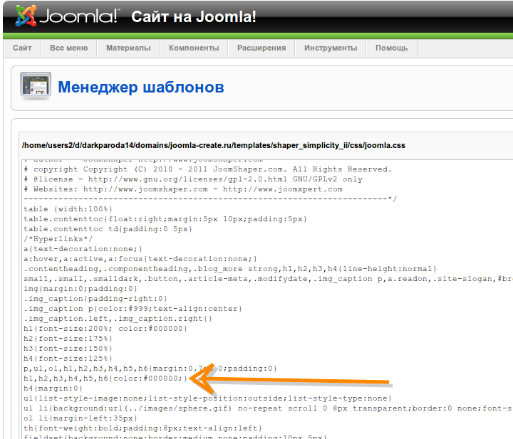 Стиль содержит в себе только значение цвета - черный. Заголовок стиля - это то к чему применятся этот цвет, т.е. ко всем заголовкам от h1, h2, h3, h4, h5, h6. Так же я подчеркнул, то что нам сейчас потребуется в первую очередь - это файл где находится данный стиль, чтобы его можно было замеить. Как видим данный CSS прописан в файле joomla.css