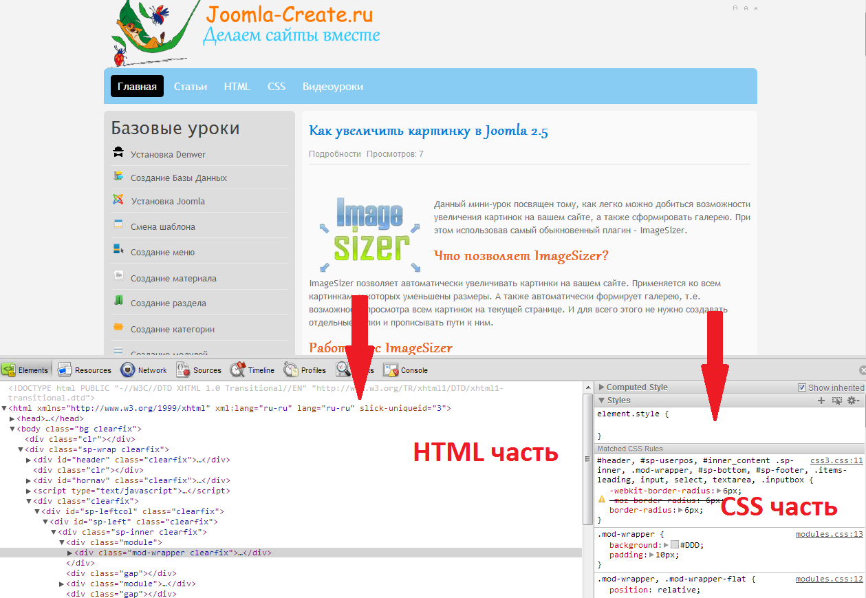 В левой части расположена вся HTML разметка текущей страницы (теги div, h1 и прочие). В правой части расположены стили CSS применяемые для выделенного класса тега.
