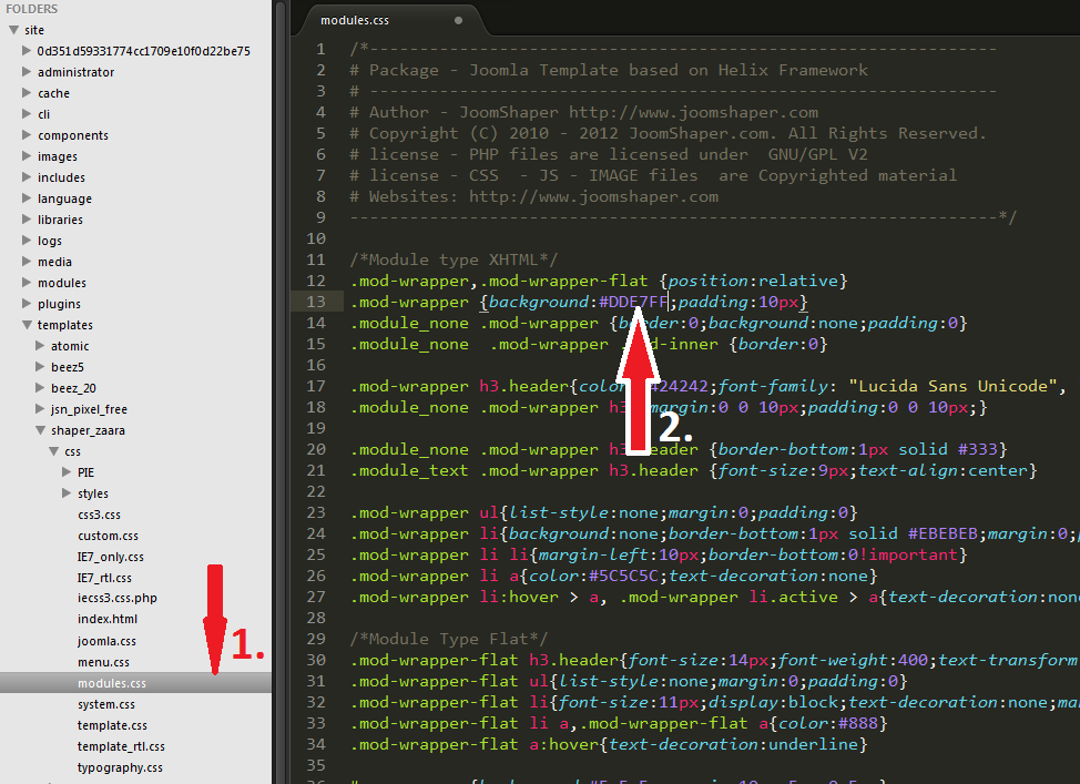 Теперь открываем Sublime Text 2 и создаем новый проект: New Folder. Выпибаем папку с нашим сайтом и заходим в папку шаблона который изменяем. В нем мы и находим файлы css а именно файл module.css. Прокручиваем до строчки 13 и вставляем наш код #DDE7FF вместо #DDD. Сохраняем.