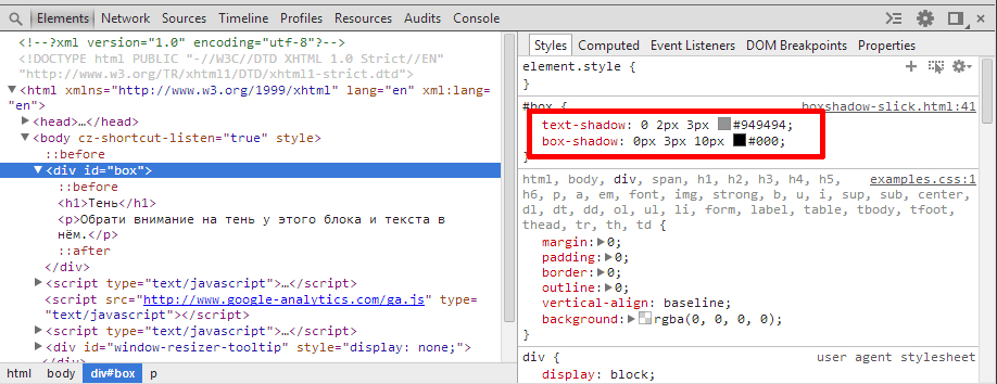 Очень важный стиль для профессиональных шаблонов. Может создаваться как для блоков, так и для текста. За это отвечают два похожих стиля. В синтаксисе указывается смещение тени, размытие и цвет. Можно создавать внутреннюю тень.