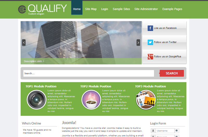Простой бесплатный шаблон зелёного цвета для Joomla 3. Разработан для всех устройств. Доступно небольшое количество самых необходимых позиций. Присутствуют только базовые настройки.