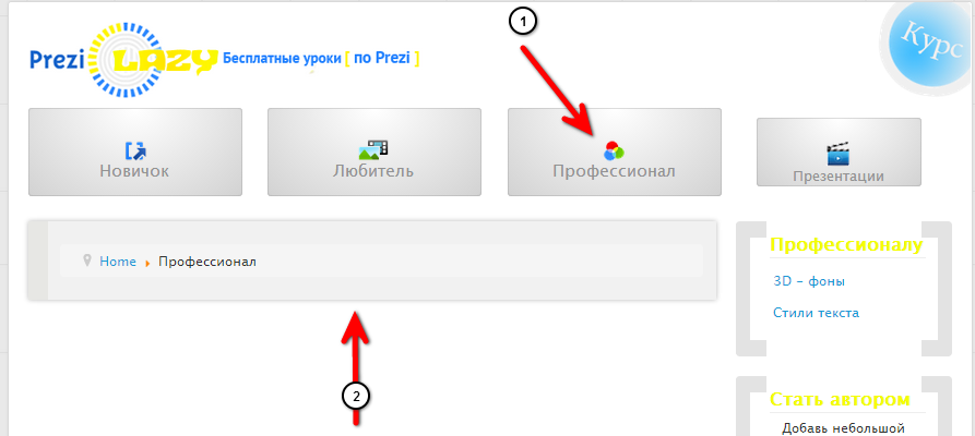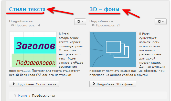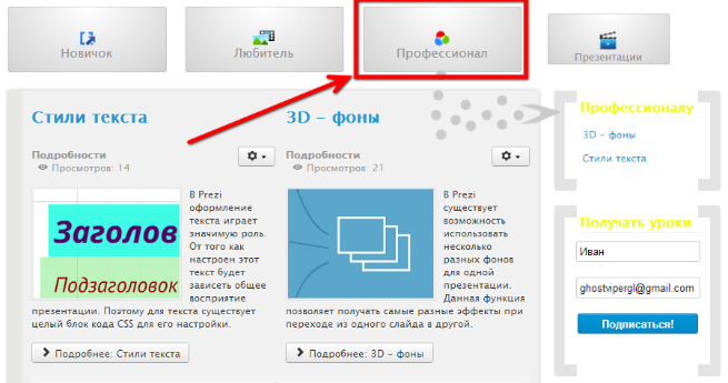 На сайте у нас есть четыре раздела: новичок, любитель, профессионал и презентации. При переходе в каждый из раздела отображается блог категорий с несколькими материалами.