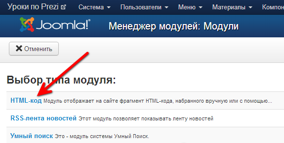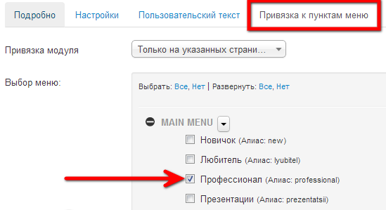 5. В пункте: Привязка к пунктам меню, указываем, где будет отображаться данный модуль.
