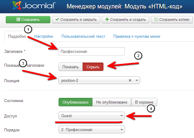 3. Называем модуль: Профессионал. Отключаем название. Выбираем позицию: breadcrumbs (под материалами).