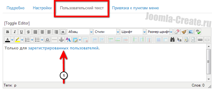 4. В пункте: "Пользовательский текст", пишем сообщение для гостей и ставим ссылку на форму регистрации.