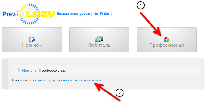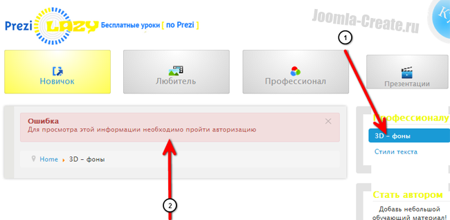 Мы будем настраивать раздел: "Профессионал", чтобы материалы данного раздела отображались только зарегистрированным пользователям.