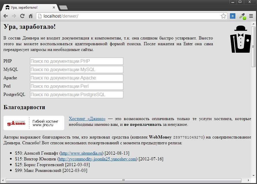 В мире больше всего зарекомендовал себя веб-сервер - apache. Но его одного - не достаточно. Нужно искать программу которая объединяют ВСЕ функции для работы сайта. Такими сборками сегодня являются: Denwer(Windows) и Xampp(Windows/Linux). Поэтому устанавливаем одну из них. Свое предпочтение я отдал - Denwer.