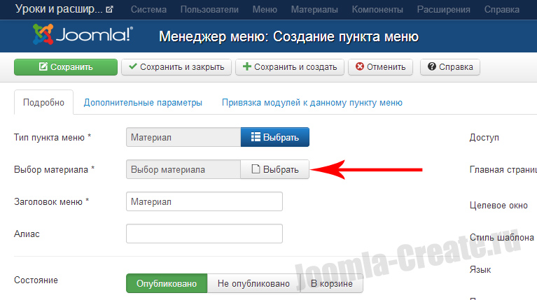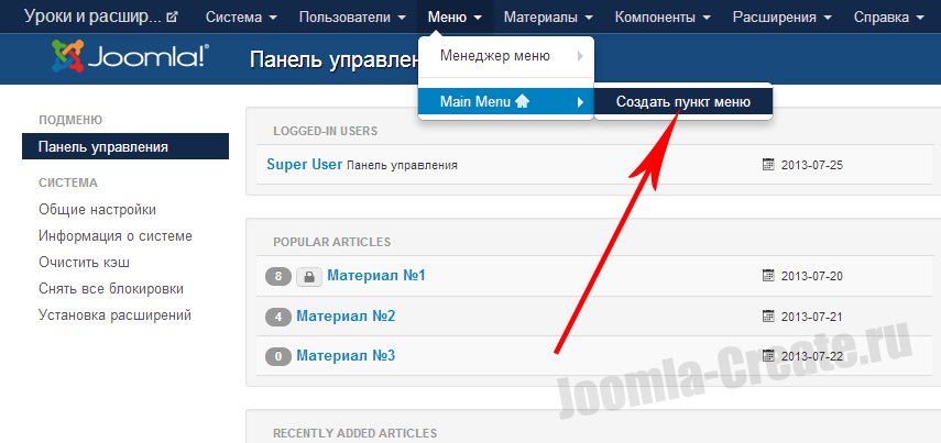 Пункты меню в Joomla крайне важны, т.к. они формируют всю структуру сайта. Именно по пунктам меню определяется то, что будет загружаться на странице и как. А определяется это всё, в одном из разделов Joomla - меню.