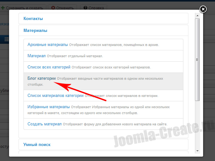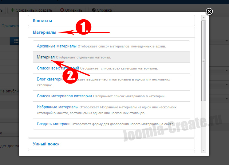3. Перед нами весь список назначения. Самый распространенный раздел списка - "Материалы". В нем происходит вывод одного или нескольких материалов, т.е. основного содержимого сайта.