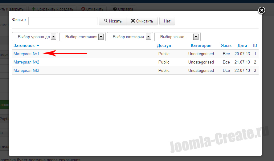 5. В списке будут отображаться абсолютно все материалы, которые мы когда-либо создавали в Joomla. Выбираем тот материал, который хотим выводить.