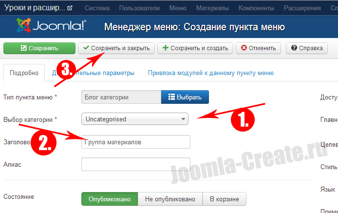2. Для блога категорий появляется новая кнопка, где нужно выбрать одну из категорий. Категории необходимы, т.к. именно они разделяют всё многообразие материалов. Для примера, можно взять стандартную категорию, на которую разделяются все материалы по умолчанию.