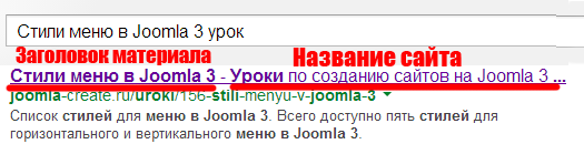 Первая фраза: Стили меню в Joomla 3 - это заголовок материала, он полностью совпадает с поисковой фразой.