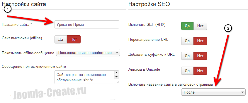 2. В настройках задаём два ключевых поля: "Название сайта" и "Включать название сайта в заголовок страницы".