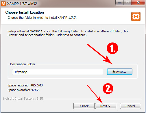 В следующем окне нужно выбрать место, где будет размещаться веб-сервер, т.е. все его файлы, включая файлы нашего сайта. Обычно это второстепенные диски - D, E