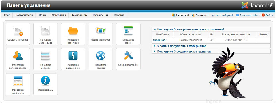 Обзор административной панели Joomla 1.7