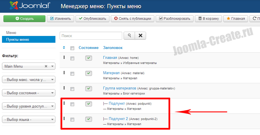 1. Перед началом работы убедитесь, что у вас есть, те самые подпункты, которые будут выпадать. Задается это путем выбора родителя в настройках пункта.