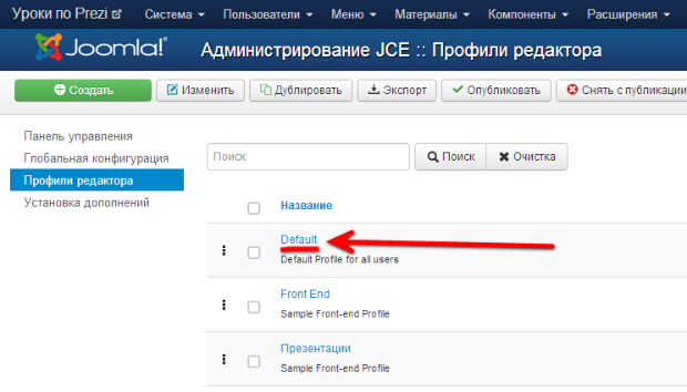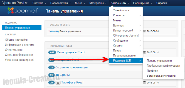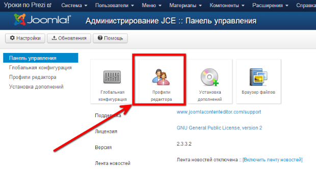 1. Переходим на главную страницу компонента JCE.