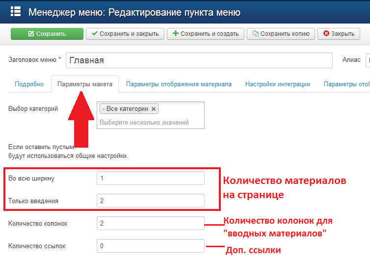 Для того, чтобы задать подобные настройки для всего сайта, необходимо перейти в "общие настройки" материалов. Для того, чтобы задать эти настройки для отдельного пункта меню, нужно перейти в редактирование этого пункта меню.