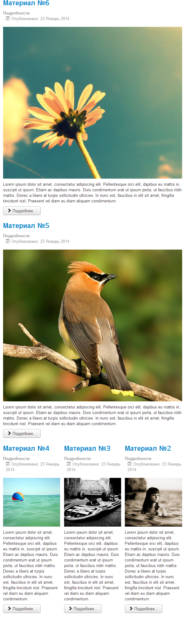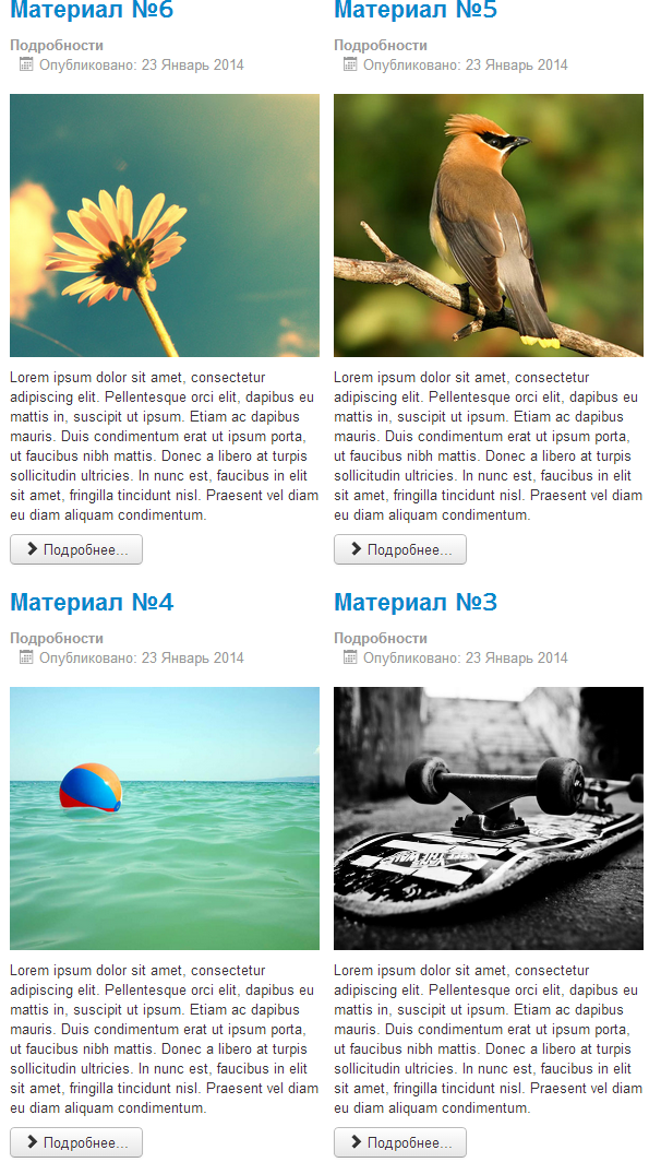 Первый материал - основной и выводится во всю ширину страницы. Все остальные отображаются в две колонки друг за другом.