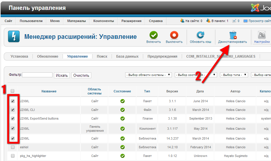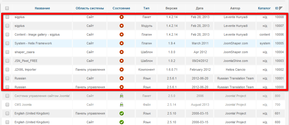 Все остальные (ранее установленные) расширения нужно отключить. Выделять и отключать нужно все расширения с тысячными id. Это позволит исключить ошибки во время обновления Joomla!