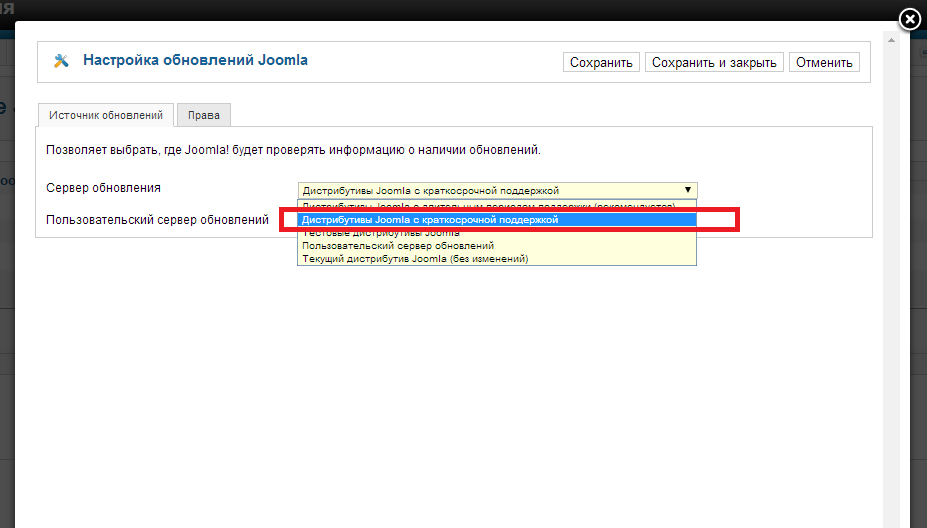 3. Во всплывающем окне, выбрать: "Дистрибутивы Joomla! с краткосрочной поддержкой".