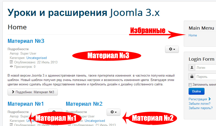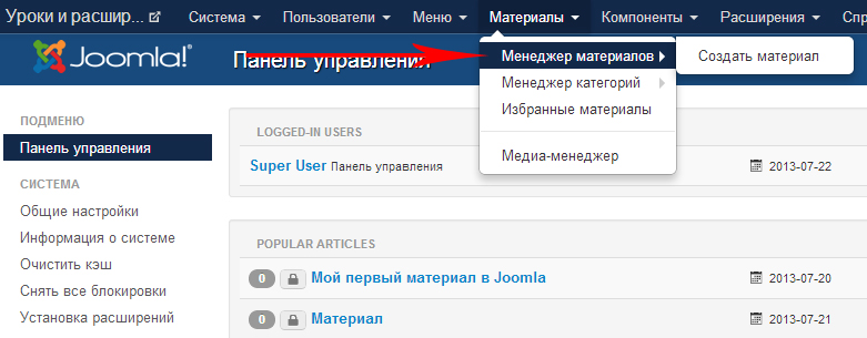 После установки Joomla главный вопрос для новичка: А как же начать выводить материалы на сайте. Как создать материала мы уже знаем - Урок, а выводить пока не научились, что ж исправим положение прямо сейчас!
