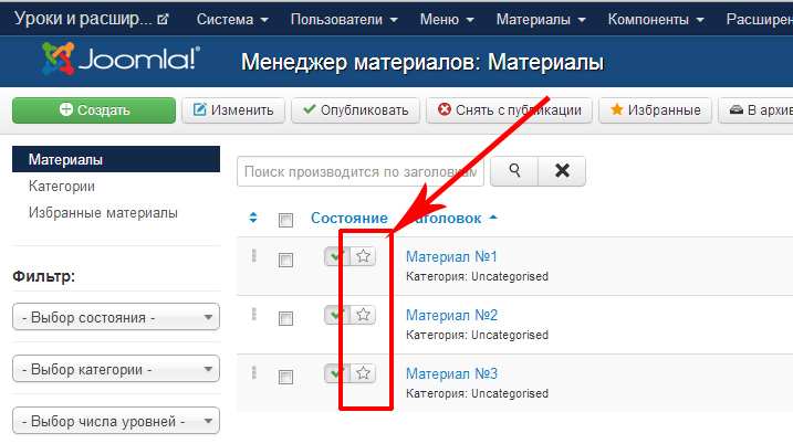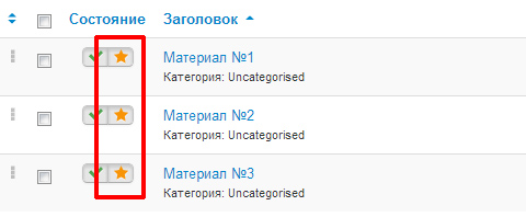 Пункт меню создается сразу после установки Joomla. Данный пункт выводит именно те материалы, которые помечены, как избранные (звездочкой).