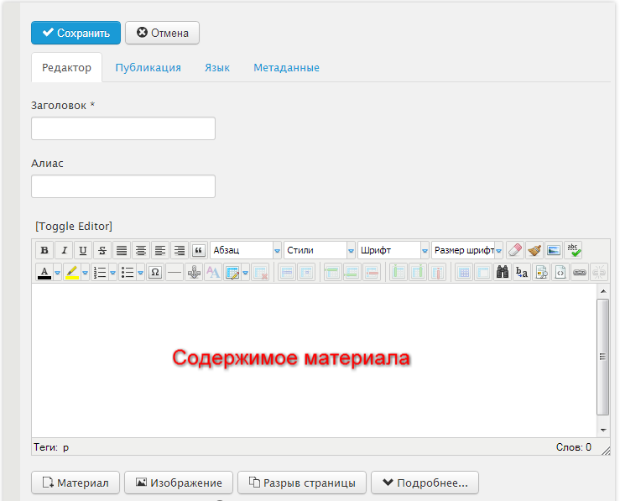 7. Переходим по ссылке: http://название_ÑайÑа/пункт_меню и оказываемся на странице с добавлением материала. Если у вас стоит index.php, то смотрите урок по его удалению.