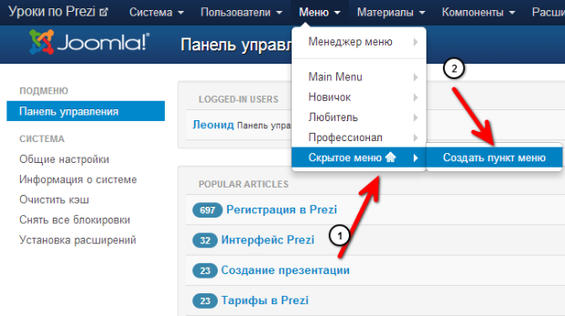 2. Создайте в нужном меню новый пункт. Создавать можно даже в скрытом меню, которого нет на сайте (для получения ссылки).