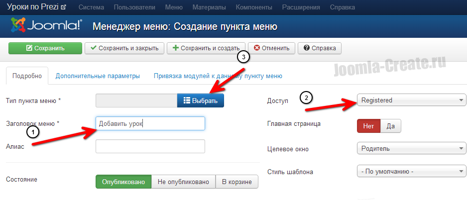 3. Задаём заголовок нового пункта меню и выбираем права "Для зарегистрированных". Чтобы только зарегистрированные пользователи могли видеть эту ссылку. (Однако в нашем случае ссылка и так видна не будет)