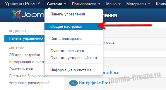 1. Для подключения капчи, нужной войти в общие настройки Joomla.