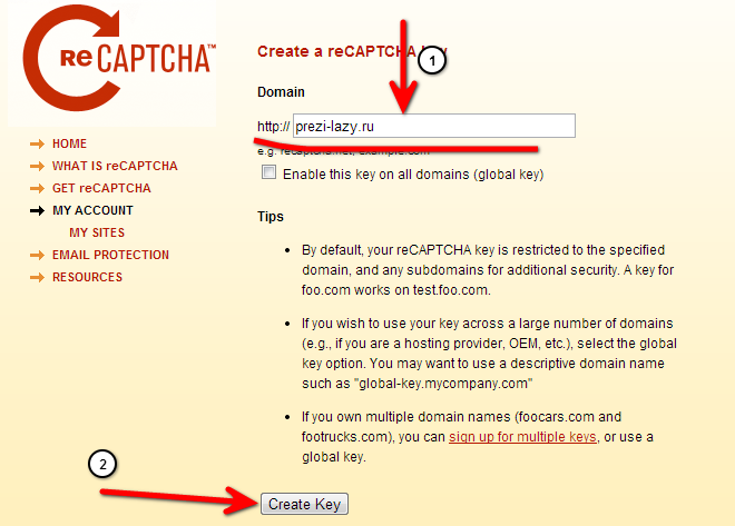 7. Введите адрес вашего сайта и нажмите кнопку Crate Key (Получить ключ).