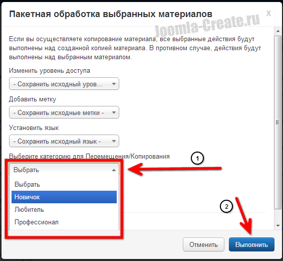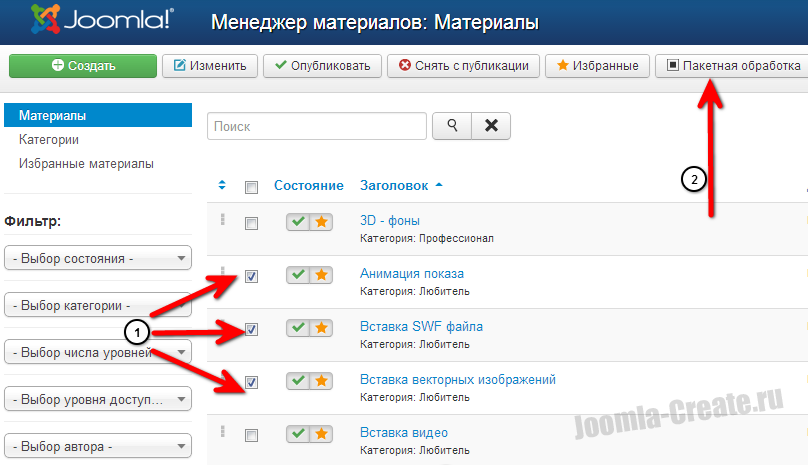 В новой версии Joomla доступна возможность пакетной обработки. Пакетная обработка серьезное дополнение, которое повышает скорость работы в Joomla в несколько раз.