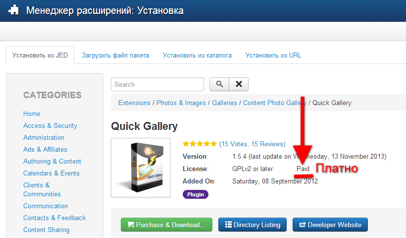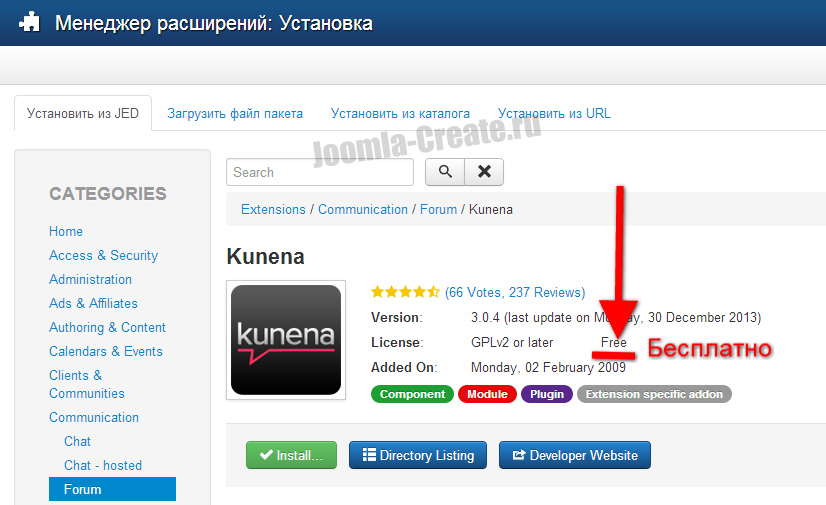 Таким образом, на основании рейтинга можно отыскать самые востребованные расширения, сравнить с другими. По типу расширения определяется то, как в дальнейшем использовать данное расширение(как компонент, модуль или плагин). Тип распространения говорит о том, получим мы расширения бесплатно, либо необходимо выложить за него деньги.