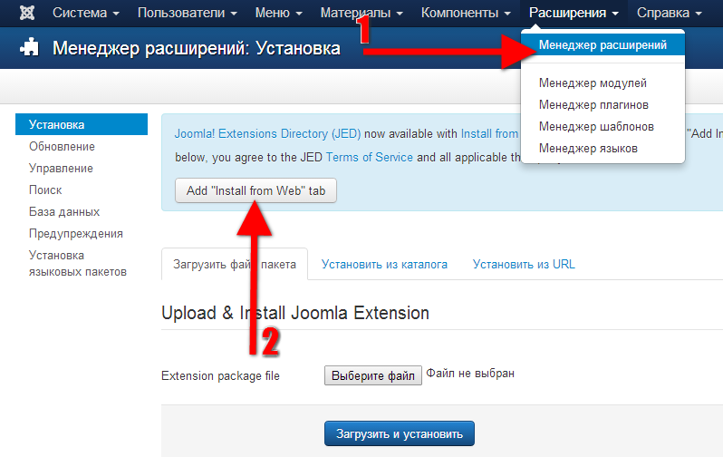 Чтобы подключить данную возможность, необходимо войти в менеджер расширений и нажать кнопку: "Add Intall from Web tab".