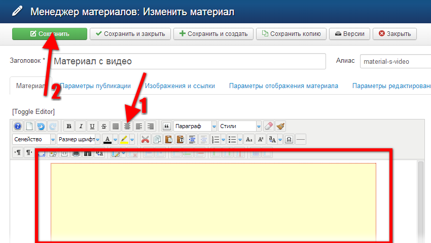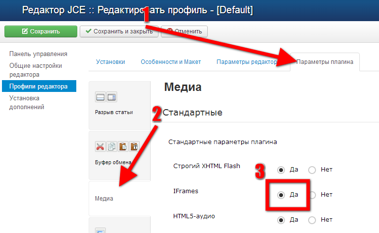 Для того чтобы вставлять видео на сайт, необходимо включить одну настройку редактора JCE (если используете именно его). Для этого: