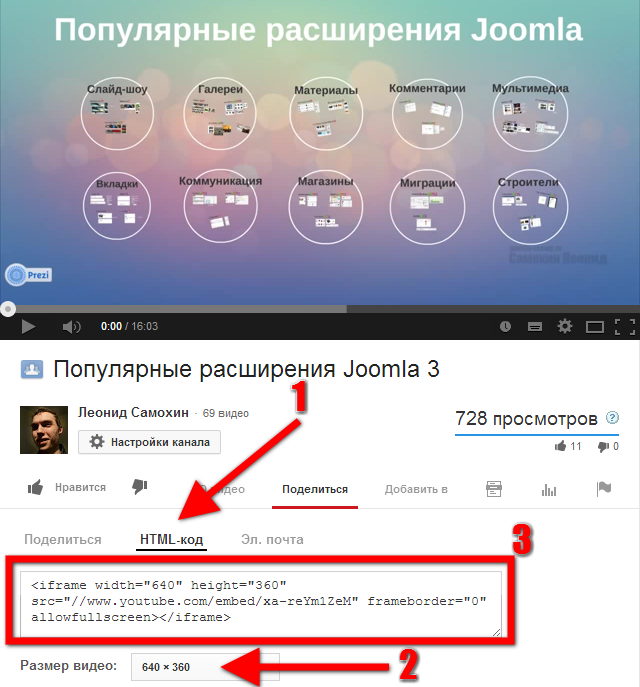 1. Открываем необходимое видео в youtube и переходим в то место системы, куда хотим поместить видео: в нашем случае в материал. Далее выбираем необходимый формат и копируем сформированный HTML код.