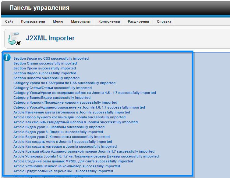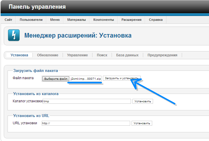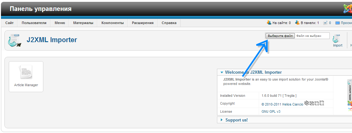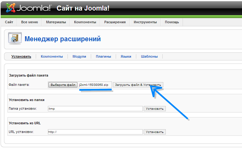 Выполняем обычную установку компонента, но уже выбираем скаченный файл J2XML Importer для Joomla 2.5.