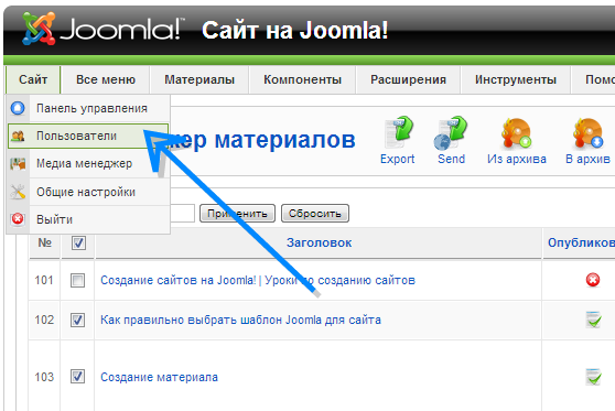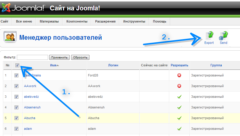 Для сохранения пользователей переходим во вкладку Сайт –> Пользователи