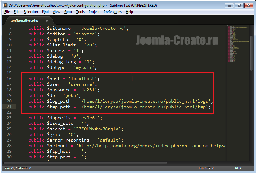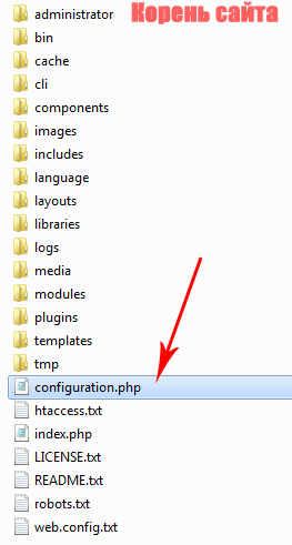 Файл расположен в корневой папке сайта и называется - configuration.php. Чтобы внести изменения в файл, необходимо открыть его с помощью любого редактора.