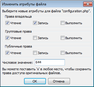 Правильное значение параметра прав - 644.